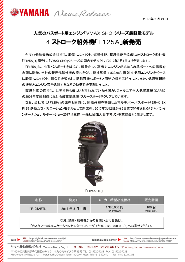 4ストローク船外機「F125A」新発売 人気のバスボート用エンジン「VMAX SHO」シリーズ最軽量モデル