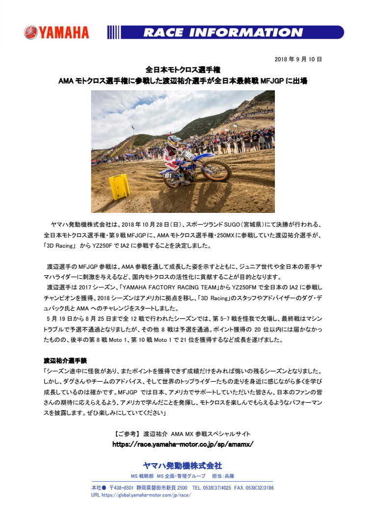 AMAモトクロス選手権に参戦した渡辺祐介選手が全日本最終戦MFJGPに出場 全日本モトクロス選手権