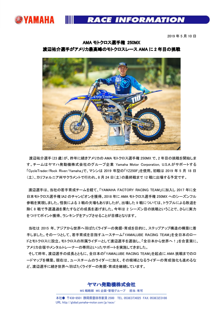 AMAモトクロス選手権 250MX 渡辺祐介選手がアメリカ最高峰のモトクロスレースAMAに2年目の挑戦