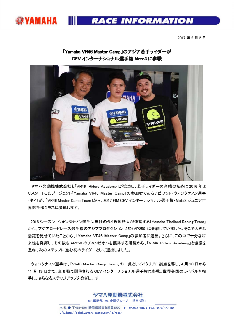 ヤマハ発動機株式会社と「VR46Riders Academy」が協力し、若手ライダーの育成のために2016年よりスタートしたプロジェクト「Yamaha VR46 Master Camp」の参加者であるアピワット・ウォンタナノン選手(タイ)が、「VR46 Master Camp Team」から、2017 FIM CEVインターナショナル選手権・Moto3ジュニア世界選手権クラスに参戦します。