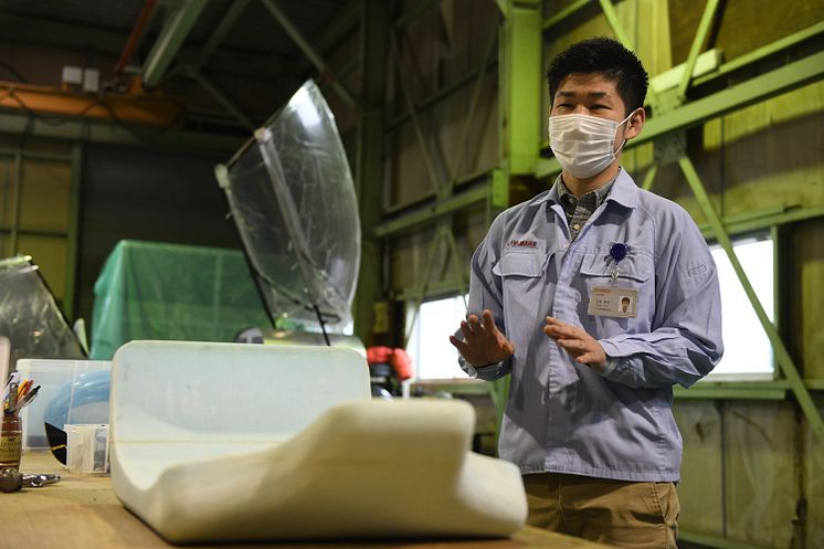 夢と志を持って、ゼロから航空機開発に挑むグループのリーダー金城さんは、京都大学在学中から人力飛行機づくりに取り組み、入社後は当社の人力飛行機同好会「チームエアロセプシー」で飛行距離の世界記録樹立を目指した経歴の持ち主です。現在は研究部門に在籍していますが、かつては産業用無人ヘリコプター「FAZER」の設計を担当したこともあります。ほとばしる情熱を発しながら、それでも急ぐことなく堅実に一歩一歩前進しようとするその姿はまさに純粋そのもの。ものづくりの原点を目の当たりにした思いでした。 (企画グループ: 海野 敏夫) |