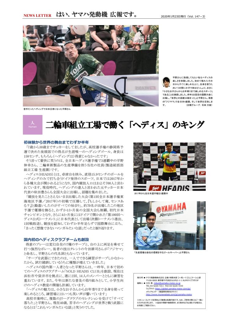 平野さんに指導してもらい私もヘディスの楽しさを体験しました。初めて触れたその日からすぐに楽しめる上に、全身を使うためいつの間にか汗で体はびっしょり。まさに「小さなお子さんからお年寄りまで楽しめるスポーツ」であることを実感しました。昨年は2回目の国際大会に出場し、「世界との距離は縮まった」と平野さん。得意の「フジヤマ」で全日本4連覇、そして世界を目指します。 (広報グループ: 石田 大樹) |