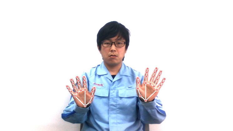 画像認識された手のひらを見せながら、モニターの向こう側にいる中高生に語りかけているのは、当社制御システム開発部の加藤毅さん。加藤さんは、静岡県が実施する「ジュニアプログラミングキャンプ in 静岡」のメンターとして、県のプログラミングコンテストで優秀な成績を収めた中学3年生と高校2年生の2名の指導を担当し、自作の教材とカリキュラムを使ってプログラミングスキルの向上を支援しました。