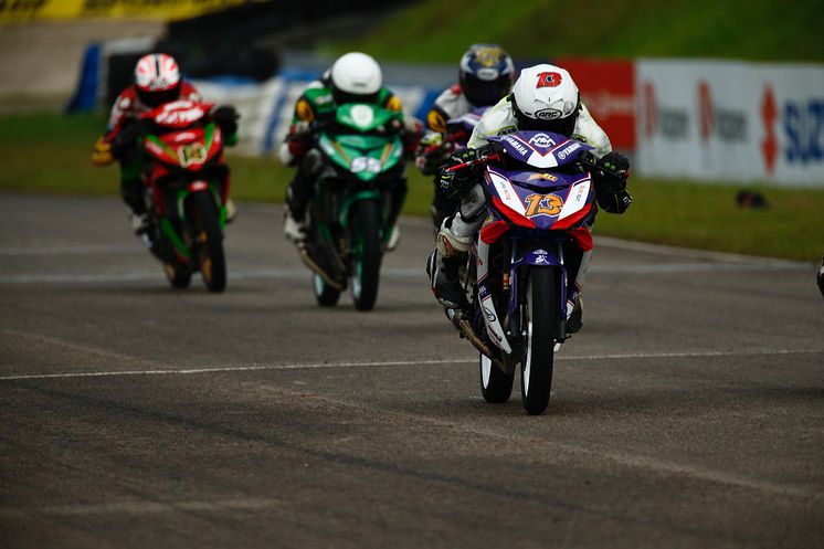 この後方では、#500 Sarmoonのチームメイト#14 Peerapong Loiboonpengが奮起。2番手グループの中で、#22 Soichiro Minamimotoや#39 Peerapong BoonlertというR25ライダーとともに順位を入れ替えながら戦いを進め、レース後半に#22 Minamimoto、#39 Boonlertが転倒リタイアとなったが、#14 Loiboonpengは最後まで走りきって6位入賞。またその後方では、「Yamaha Racing Indonesia」のエース#99 Galang Hendra Pratamaが9位でチェッカーを受けた。