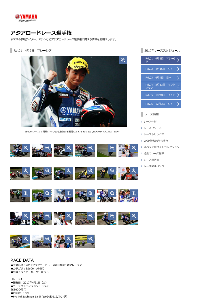 「ライバルが新型を投入し注目が集まりましたが、エンジンを中心に熟成を遂げてきたYZF-R25もまた、決して引けを取っていないことがわかりました。Anupab選手が両レースで表彰台を獲得したことが、それを示していると思います。しかしながら、まだ十分ではありません。Anupab以外の2人のライダーは表彰台に立つことができていないためです。上を狙うには、ライダー、マシンともにしっかりとしたインプルーブが必要だと考えています。時間はありませんが、次回のタイでは進化した姿をお見せします。ぜひご期待ください」