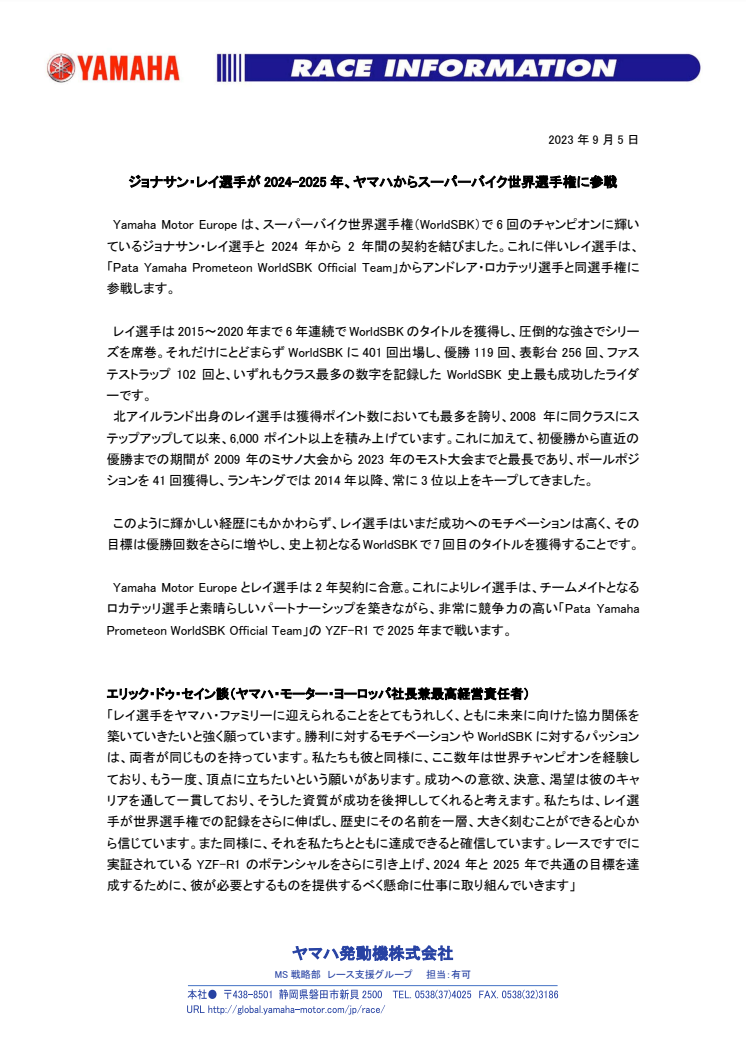 Yamaha Motor Europeは、スーパーバイク世界選手権(WorldSBK)で6回のチャンピオンに輝いているジョナサン・レイ選手と2024年から2年間の契約を結びました。これに伴いレイ選手は、「Pata Yamaha Prometeon WorldSBK Official Team」からアンドレア・ロカテッリ選手と同選手権に参戦します。