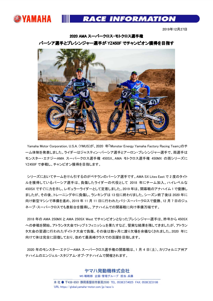 Yamaha Motor Corporation, U.S.A. (YMUS)が、2020 年「Monster Energy Yamaha Factory Racing Team」のチーム体制を発表しました。ライダーはジャスティン・バーシア選手とアーロン・プレシンジャー選手で、両選手はモンスター・エナジーAMAスーパークロス選手権450SX、AMAモトクロス選手権450MXの両シリーズにYZ450Fで参戦し、チャンピオン獲得を目指します。