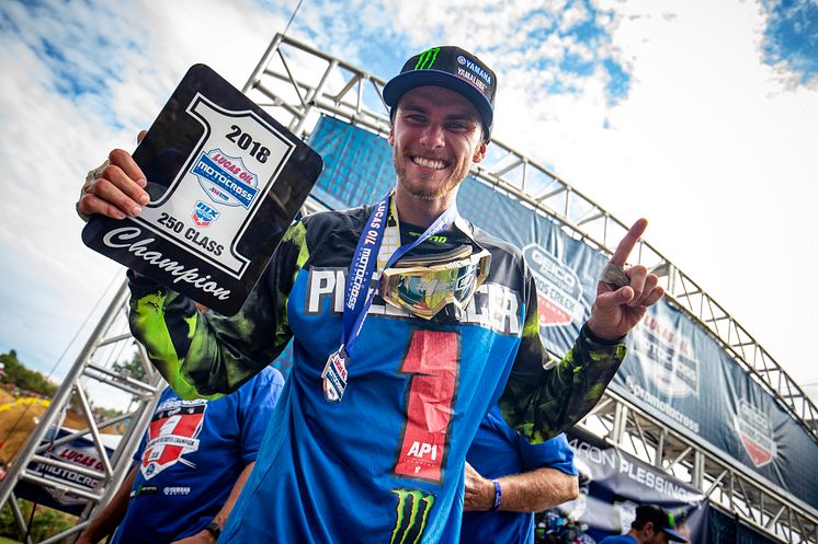 2018年8月18日(土)、アメリカ・メリーランド州で行われたAMAモトクロス第11戦バッズクリーク大会で、「Monster Energy/Yamalube/Star/Yamaha Racing」からYZ250Fで250MXに参戦するアーロン・プレシンジャー選手が、最終戦(第12戦)を待たずして自身初のチャンピオンを獲得しました。今年5月に終了したAMAスーパークロス250SXウエストでもチャンピオンを獲得していることから、プレシンジャー選手はシーズン2冠を達成したこととなります。