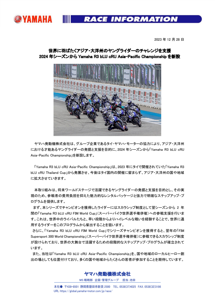 ヤマハ発動機株式会社は、グループ企業であるタイ・ヤマハ・モーターの協力により、アジア・大洋州における才能あるヤングライダーの発掘と支援を目的に、2024年シーズンから「Yamaha R3 bLU cRU Asia-Pacific Championship」を新設します。