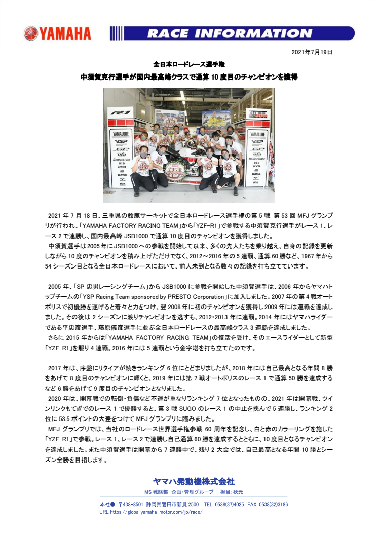 2021年7月18日、三重県の鈴鹿サーキットで全日本ロードレース選手権の第5戦 第53回MFJグランプリが行われ、「YAMAHA FACTORY RACING TEAM」から「YZF-R1」で参戦する中須賀克行選手がレース1、レース2で連勝し、国内最高峰JSB1000で通算10度目のチャンピオンを獲得しました。