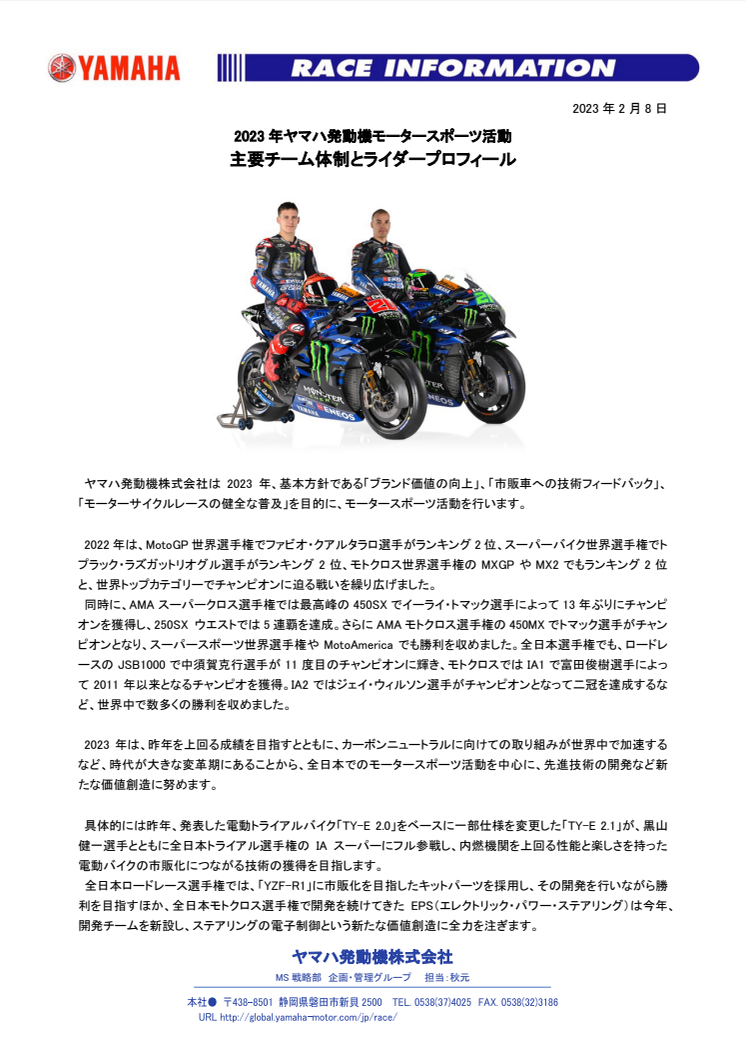 2023年もレース結果にこだわりながら、ブランディング、技術開発、普及・育成に全力を尽くすヤマハ発動機のモータースポーツ活動にご期待ください。