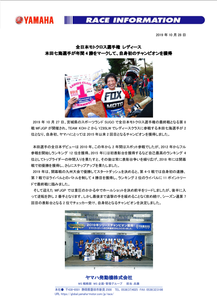 2019年10月27日、宮城県のスポーツランドSUGOで全日本モトクロス選手権の最終戦となる第8戦MFJGPが開催され、TEAM KOH-ZからYZ85LWでレディースクラスに参戦する本田七海選手が2位となり、自身初、ヤマハにとっては2015年以来2回目となるチャンピオンを獲得しました。