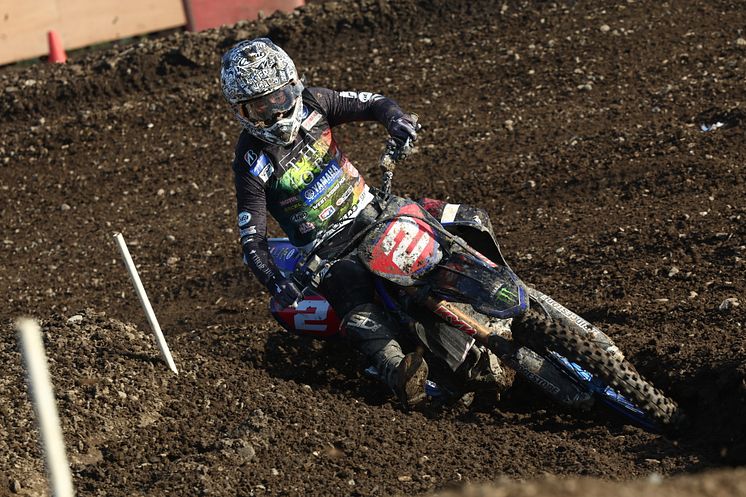 2022年はEPS(エレクトリック・パワー・ステアリング)を搭載した「YZ450FM」で参戦。開幕戦の九州大会で両ヒートで優勝してスタートダッシュを決めると、15分+1周の3ヒート制で行われた第2戦は、ヒート1こそ転倒があり5位となるも、ヒート2では3勝目、ヒート3では2位と、ランキングトップをキープしました。