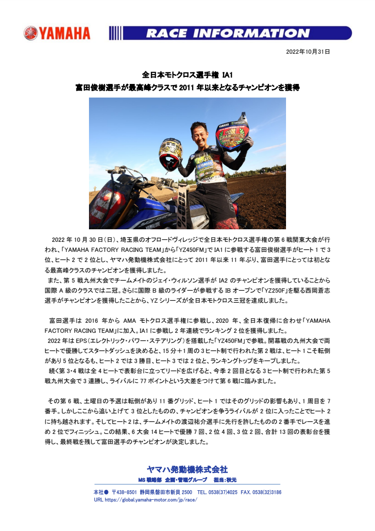2022年10月30日(日)、埼玉県のオフロードヴィレッジで全日本モトクロス選手権の第6戦関東大会が行われ、「YAMAHA FACTORY RACING TEAM」から「YZ450FM」でIA1に参戦する富田俊樹選手がヒート1で3位、ヒート2で2位とし、ヤマハ発動機株式会社にとって2011年以来11年ぶり、富田選手にとっては初となる最高峰クラスのチャンピオンを獲得しました。