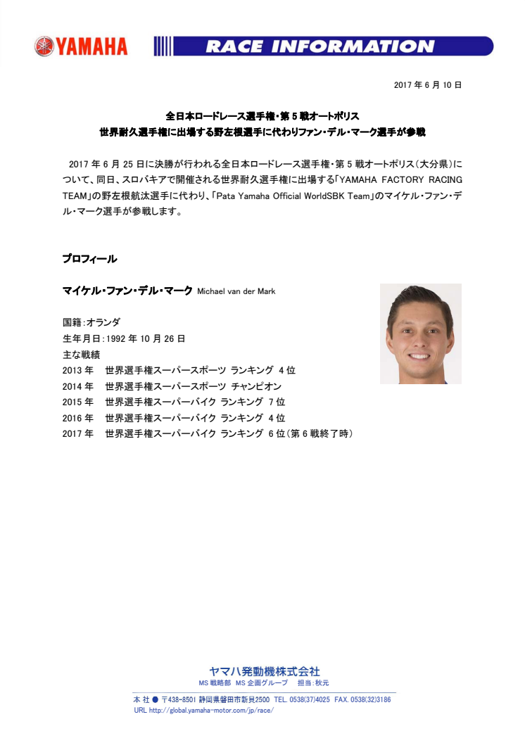 2017年6月25日に決勝が行われる全日本ロードレース選手権・第5戦オートポリス(大分県)について、同日、スロバキアで開催される世界耐久選手権に出場する「YAMAHA FACTORY RACING TEAM」の野左根航汰選手に代わり、「Pata Yamaha Official WorldSBK Team」のマイケル・ファン・デル・マーク選手が参戦します。