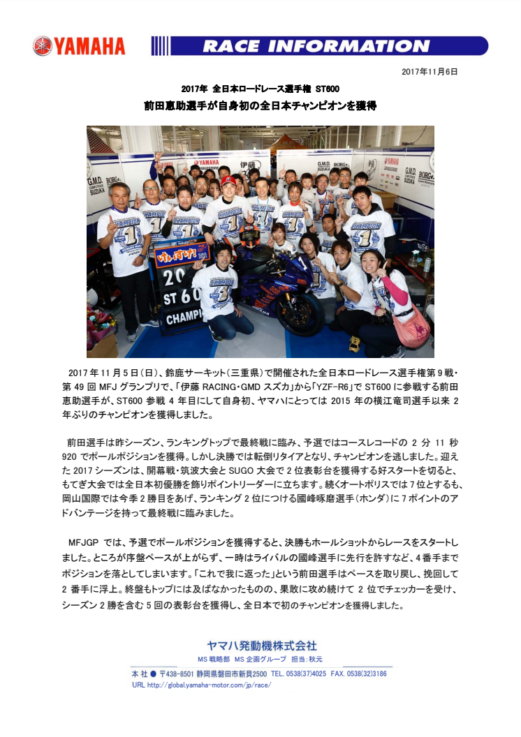 2017年11月5日(日)、鈴鹿サーキット(三重県)で開催された全日本ロードレース選手権第9戦・第49回MFJグランプリで、「伊藤RACING・GMDスズカ」から「YZF-R6」でST600に参戦する前田恵助選手が、ST600参戦4年目にして自身初、ヤマハにとっては2015年の横江竜司選手以来2年ぶりのチャンピオンを獲得しました。