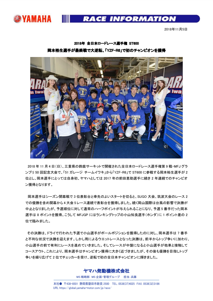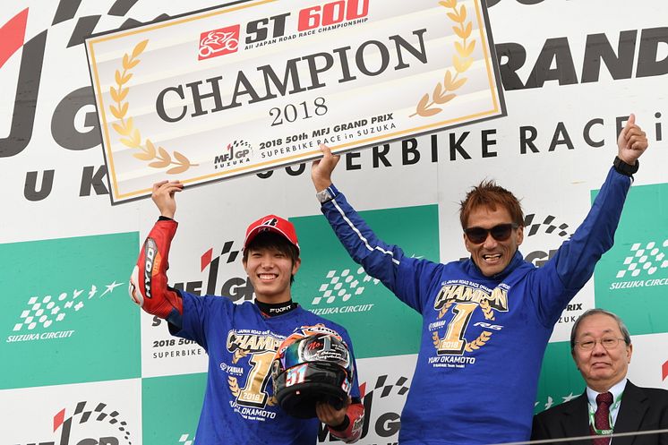 2018年11月4日(日)、三重県の鈴鹿サーキットで開催された全日本ロードレース選手権第9戦・MFJグランプリ50回記念大会で、「51ガレージ チームイワキ」から「YZF-R6」でST600に参戦する岡本裕生選手が2位とし、岡本選手にとっては自身初、ヤマハとしては2017年の前田恵助選手に続き2年連続でのチャンピオン獲得となります。