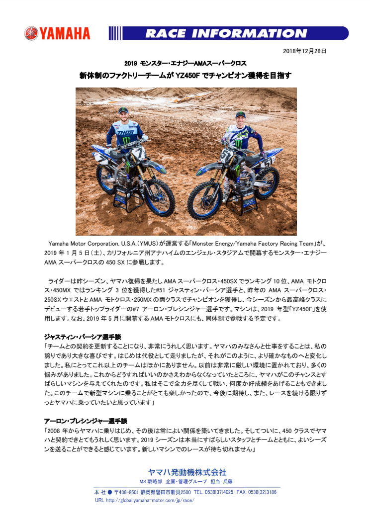 ライダーは昨シーズン、ヤマハ復帰を果たしAMAスーパークロス・450SXでランキング10位、AMA モトクロス・450MXではランキング3位を獲得した#51ジャスティン・バーシア選手と、昨年のAMAスーパークロス・250SXウエストとAMA モトクロス・250MXの両クラスでチャンピオンを獲得し、今シーズンから最高峰クラスにデビューする若手トップライダーの#7アーロン・プレシンジャー選手です。マシンは、2019年型「YZ450F」を使用します。なお、2019年5月に開幕するAMAモトクロスにも、同体制で参戦する予定です。
