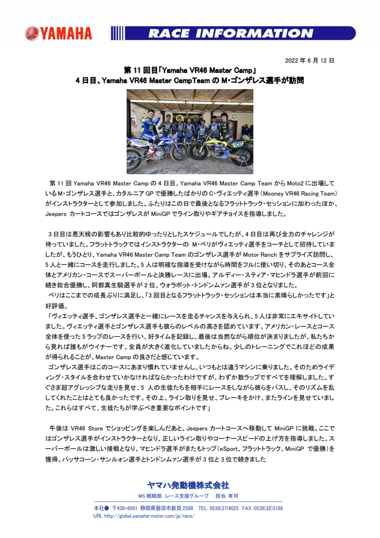 「Motor Ranchは2度目になりますが、本当に素晴らしくて、とても難しかったです。マシンは前とは違っていましたが、またたくさんのことを学びました。ここに来ることはいつも私の夢であり、またすぐにでもロッシ選手やVR46 Riders Academyの仲間たちのところへ戻って来たいと思っています。5人はMotor RanchでもJeepersカートコースでも非常に速く、両カテゴリーで高いスキルを見せました。Motor Ranchでは私を負かすほどだったので、次回は一緒にレースしたいですね!