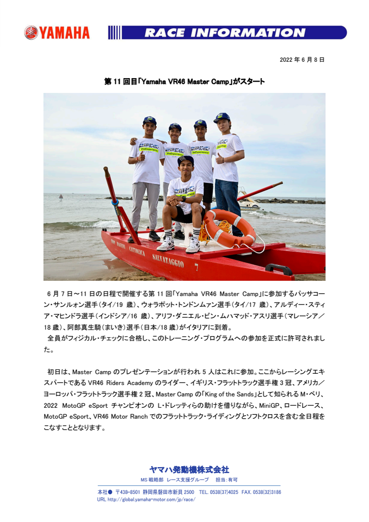 6月7日~11日の日程で開催する第11回「Yamaha VR46 Master Camp」に参加するパッサコーン・サンルォン選手(タイ/19歳)、ウォラポット・トンドンムァン選手(タイ/17歳)、アルディー・スティア・マヒンドラ選手(インドシア/16歳)、アリフ・ダニエル・ビン・ムハマッド・アスリ選手(マレーシア/18歳)、阿部真生騎(まいき)選手(日本/18歳)がイタリアに到着。