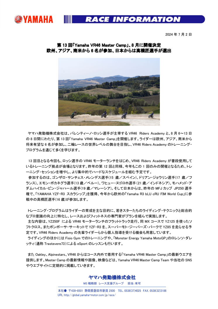 ヤマハ発動機株式会社は、バレンティーノ・ロッシ選手が主宰するVR46 Riders Academyと、8月6~13日の8日間にわたり、第13回「Yamaha VR46 Master Camp」を開催します。ライダーは欧州、アジア、南米から将来有望な6名が参加し、二輪レースの世界レベルの舞台を目指し、VR46 Riders Academyのトレーニング・プログラムを通じて多くを学びます。