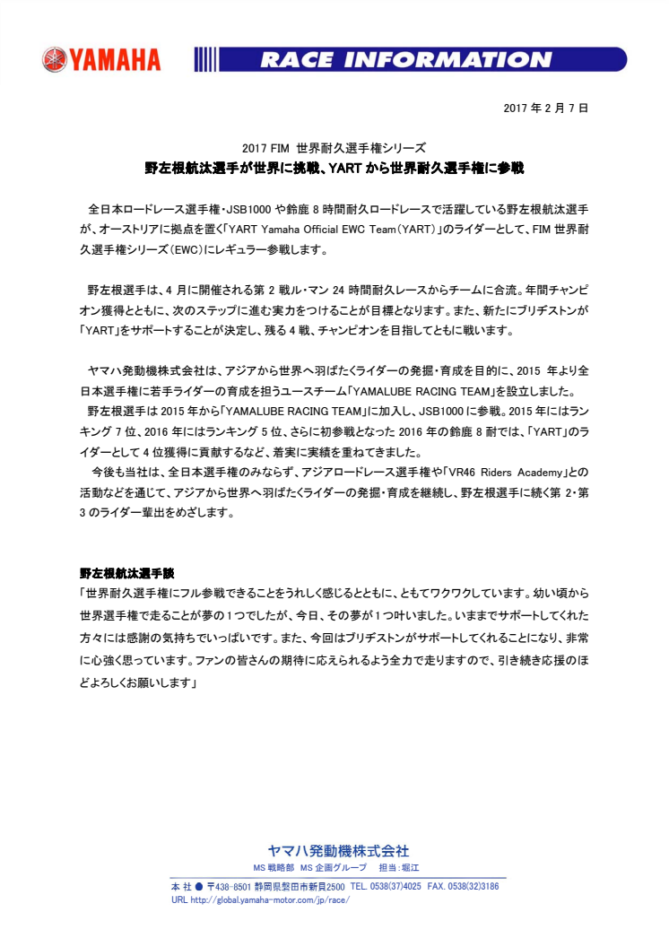 全日本ロードレース選手権・JSB1000や鈴鹿8時間耐久ロードレースで活躍している野左根航汰選手が、オーストリアに拠点を置く「YART Yamaha Official EWC Team(YART)」のライダーとして、FIM世界耐久選手権シリーズ(EWC)にレギュラー参戦します。