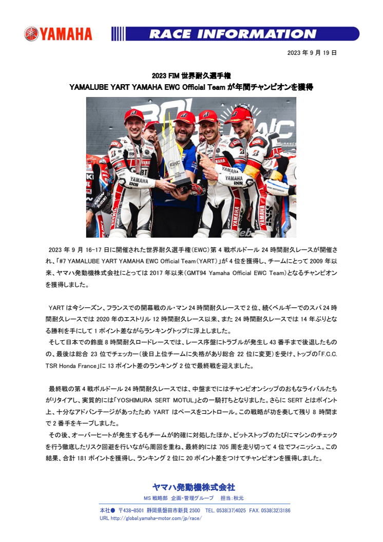 2023年9月16-17日に開催された世界耐久選手権(EWC)第4戦ボルドール24時間耐久レースが開催され、「#7 YAMALUBE YART YAMAHA EWC Official Team(YART)」が4位を獲得し、チームにとって2009年以来、ヤマハ発動機株式会社にとっては2017年以来(GMT94 Yamaha Official EWC Team)となるチャンピオンを獲得しました。