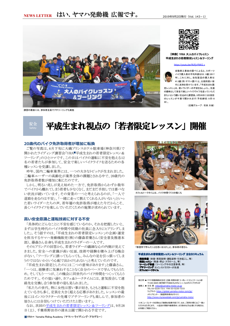 自動車工業会の調べによると、スポーツバイク購入者の平均年齢は52.0歳(2017年)。これに対し、当社製品の購入者は41.3歳(同・ヤマハ調べ)と、比較的若い世代に支持を受けています。「平成生まれ限定レッスン」は、若いライダーの不安を払しょくし、生涯の趣味として安全で楽しいバイクライフを送っていただきたいという願いを込めた講習会。9月28日には2回目のレッスンが千葉で開かれます(予約締切:9月10日)。 (広報グループ: 石田 大樹) |