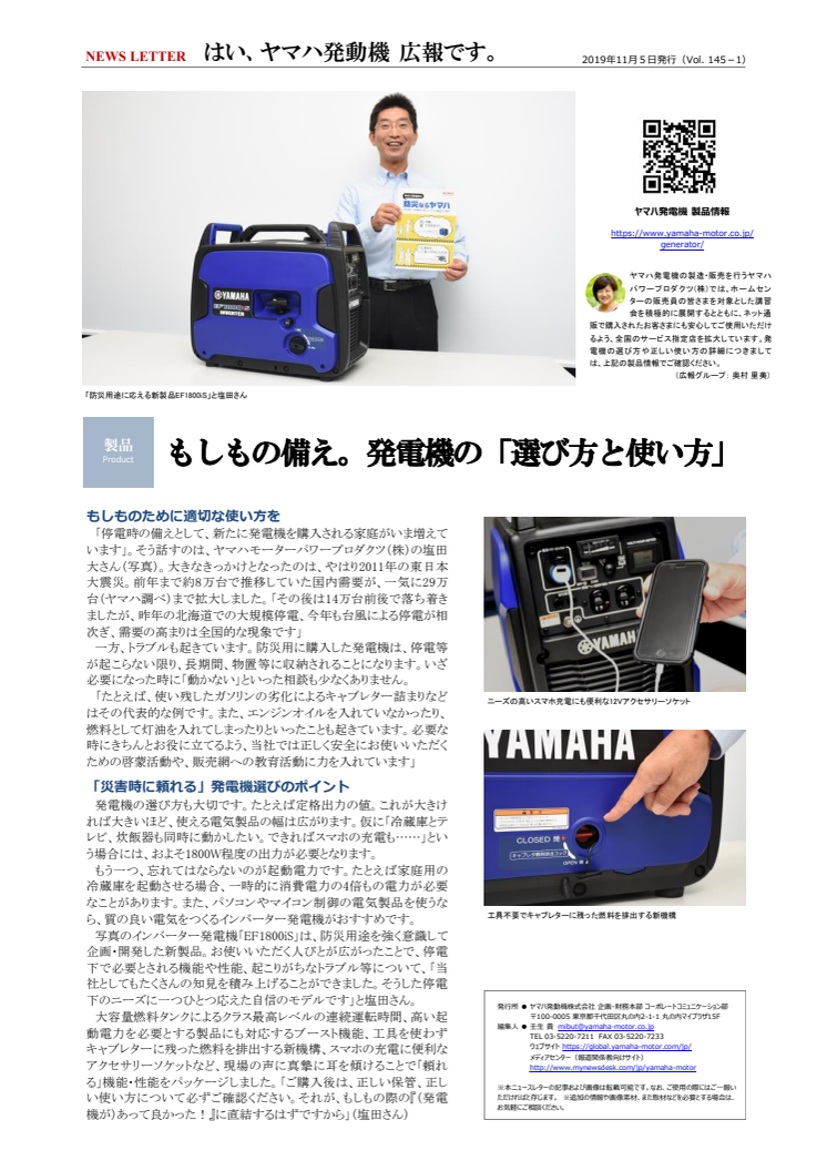ヤマハ発電機の製造・販売を行うヤマハパワープロダクツ(株)では、ホームセンターの販売員の皆さまを対象とした講習会を積極的に展開するとともに、ネット通販で購入されたお客さまにも安心してご使用いただけるよう、全国のサービス指定店を拡大しています。発電機の選び方や正しい使い方の詳細につきましては、上記の製品情報でご確認ください。 (広報グループ: 奥村 里美) |