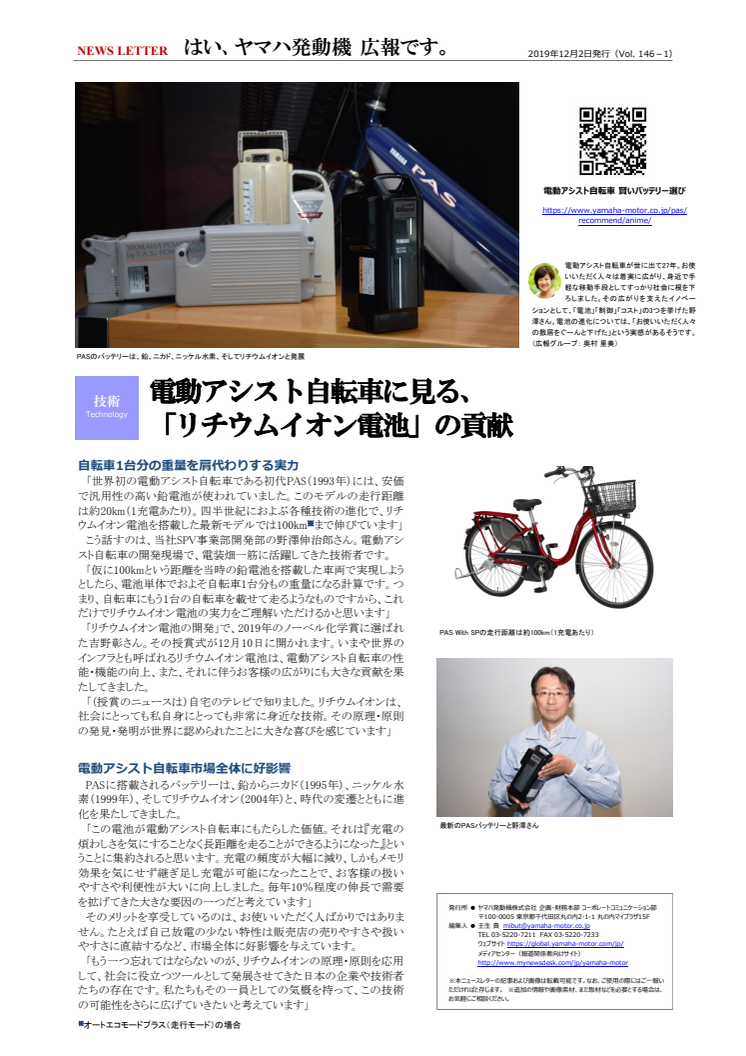 電動アシスト自転車が世に出て27年。お使いいただく人々は着実に広がり、身近で手軽な移動手段としてすっかり社会に根を下ろしました。その広がりを支えたイノベーションとして、「電池」「制御」「コスト」の3つを挙げた野澤さん。電池の進化については、「お使いいただく人々の敷居をぐーんと下げた」という実感があるそうです。 (広報グループ: 奥村 里美) |
