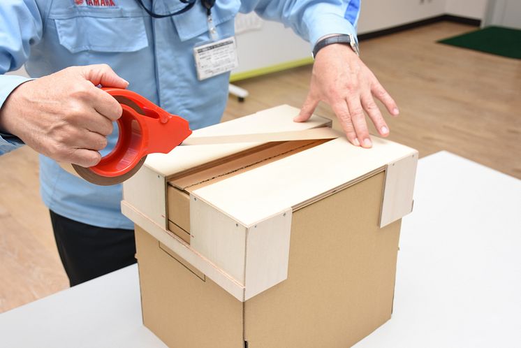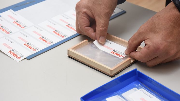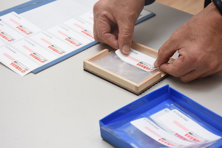 合理的配慮、とは――。「たとえば部品包装用のビニール袋にラベルシールを貼る作業では、『このあたり』とか『見本と同じように』という曖昧な指示は避けなくてはなりません。判断や加減を必要とせず、自分の力で業務を完遂させるための支援が必要です」。写真は、鷺坂さん手づくりの木製治具。透けたビニール袋ごしに正しいラベルシールの貼り位置が見えるよう工夫されています。この他にも各作業場には、鷺坂さんがアイデアを凝らしたさまざまな手づくり治具が並んでいます。