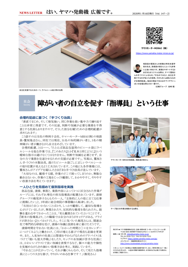 こう話すのは当社の特例子会社、ヤマハモーターMIRAI(株)の相談員・鷺坂隆志さん。同社では現在、31名の知的障がい者と、3名の精神障がい者が働きながら自立をめざしています。