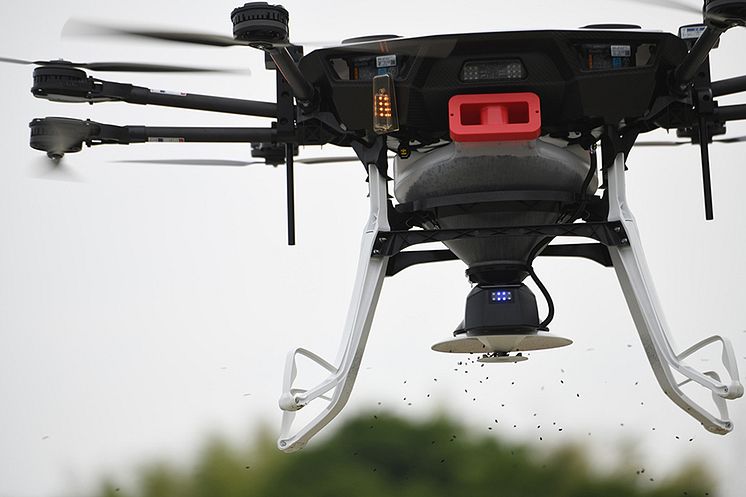 産業用マルチローター(ドローン)「YMR-08AP」に装着された粒剤散布装置から落下する黒い小さな粒。これはツヤの良さと白さで人気の静岡県産特A米「きぬむすめ」の種もみです。5月下旬、静岡県浜松市の加茂農園の水田で、ドローンによる種もみの散布が行われました。