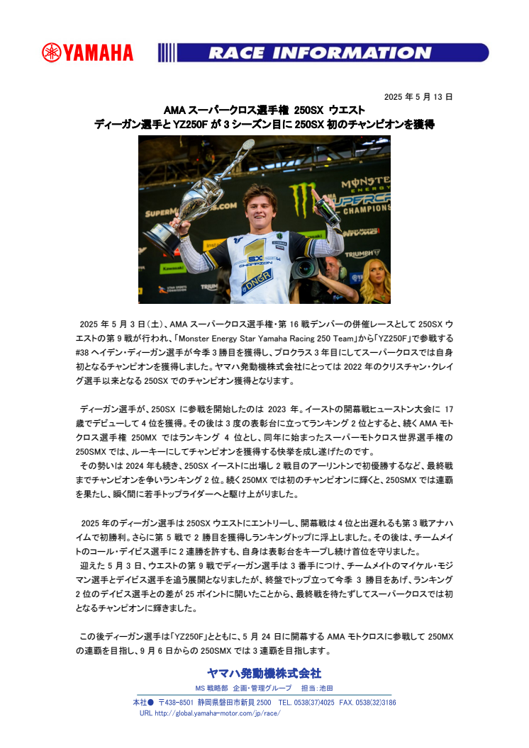 2025年5月3日(土)、AMAスーパークロス選手権・第16戦デンバーの併催レースとして250SXウエストの第9戦が行われ、「Monster Energy Star Yamaha Racing 250 Team」から「YZ250F」で参戦する#38ヘイデン・ディーガン選手が今季3勝目を獲得し、プロクラス3年目にしてスーパークロスでは自身初となるチャンピオンを獲得しました。ヤマハ発動機株式会社にとっては2022年のクリスチャン・クレイグ選手以来となる250SXでのチャンピオン獲得となります。