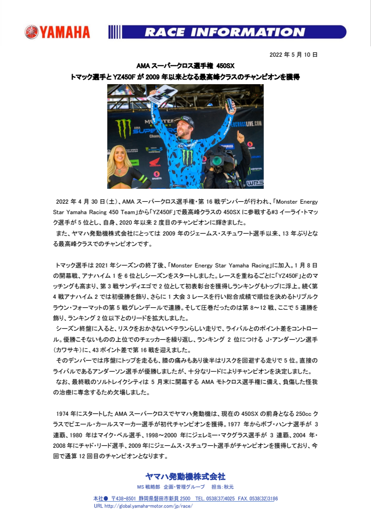 2022年4月30日(土)、AMAスーパークロス選手権・第16戦デンバーが行われ、「Monster Energy Star Yamaha Racing 450 Team」から「YZ450F」で最高峰クラスの450SXに参戦する#3イーライ・トマック選手が5位とし、自身、2020年以来2度目のチャンピオンに輝きました。