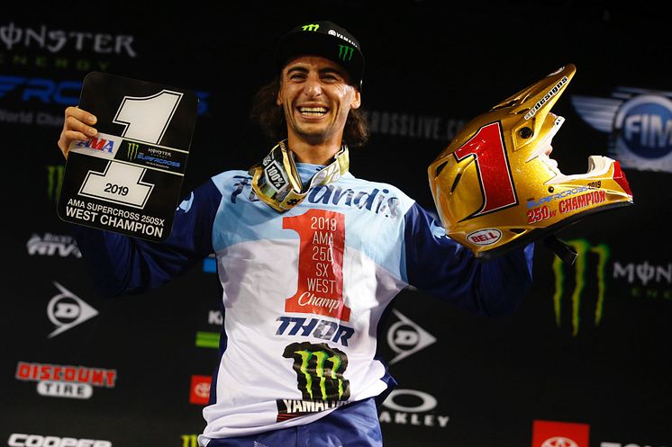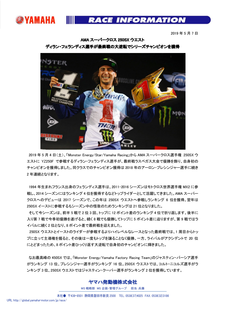 2019年5月4日(土)、「Monster Energy/Star/Yamaha Racing」からAMAスーパークロス選手権 250SXウエストにYZ250Fで参戦するディラン・フェランディス選手が、最終戦ラスベガス大会で優勝を飾り、自身初のチャンピオンを獲得しました。同クラスでのチャンピオン獲得は2018年のアーロン・プレシンジャー選手に続き2年連続となります。