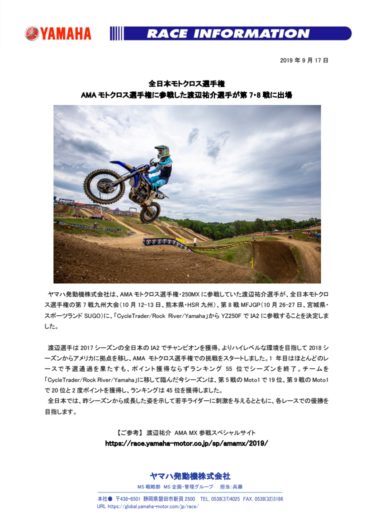 ヤマハ発動機株式会社は、AMAモトクロス選手権・250MXに参戦していた渡辺祐介選手が、全日本モトクロス選手権の第7戦九州大会(10月12-13日、熊本県・HSR九州)、第8戦MFJGP(10月26-27日、宮城県・スポーツランドSUGO)に、「CycleTrader/Rock River/Yamaha」からYZ250FでIA2に参戦することを決定しました。