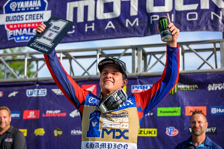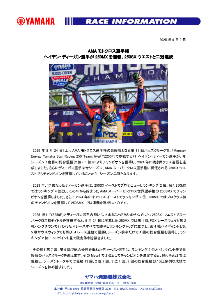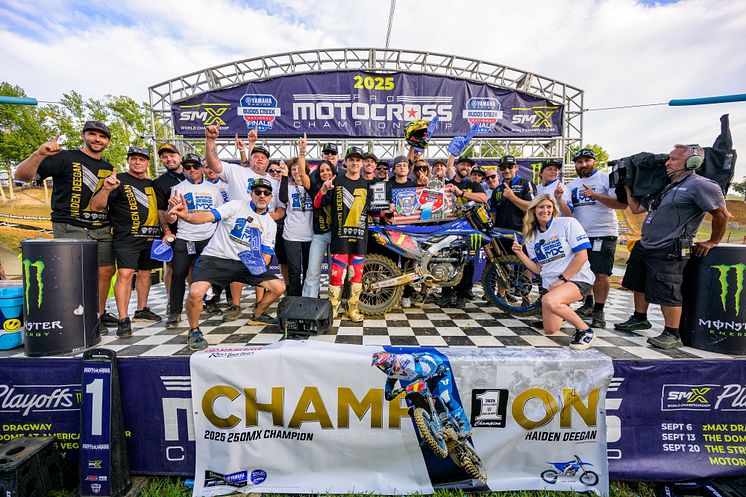 2025年8月24日(土)、AMAモトクロス選手権の最終戦となる第11戦バッズクリークで、「Monster Energy Yamaha Star Racing 250 Team」から「YZ250F」で参戦する#1 ヘイデン・ディーガン選手が、今シーズン7度目の総合優勝(2位/1位)によりチャンピオンを獲得し、2024年に続き同クラス連覇を達成しました。さらにディーガン選手は今シーズン、AMAスーパークロス選手権に併催される250SXウエストでもチャンピオンを獲得していることから、シーズン二冠となります。