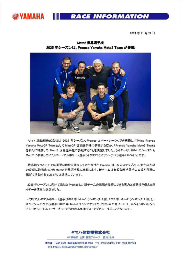 ヤマハ発動機株式会社は2025 年シーズン、Pramac とパートナーシップを構築し、「Prima Pramac Yamaha MotoGP Team」としてMotoGP 世界選手権に参戦するほか、「Pramac Yamaha Moto2 Team」を新たに結成してMoto2 世界選手権に参戦することを決定しました。ライダーは2024 年シーズンもMoto2 に参戦していたトニー・アルボリーノ選手(イタリア)とイサン・ゲバラ選手(スペイン)です。