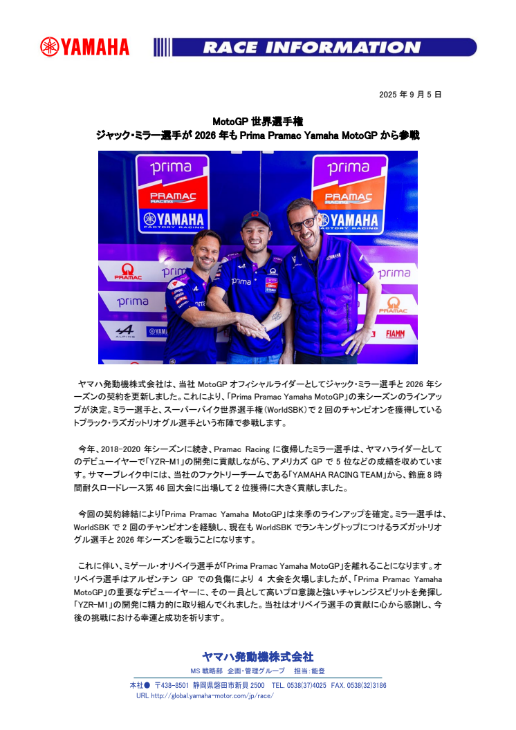 今回の契約締結により「Prima Pramac Yamaha MotoGP」は来季のラインアップを確定。ミラー選手は、WorldSBKで2回のチャンピオンを経験し、現在もWorldSBKでランキングトップにつけるラズガットリオグル選手と2026年シーズンを戦うことになります。