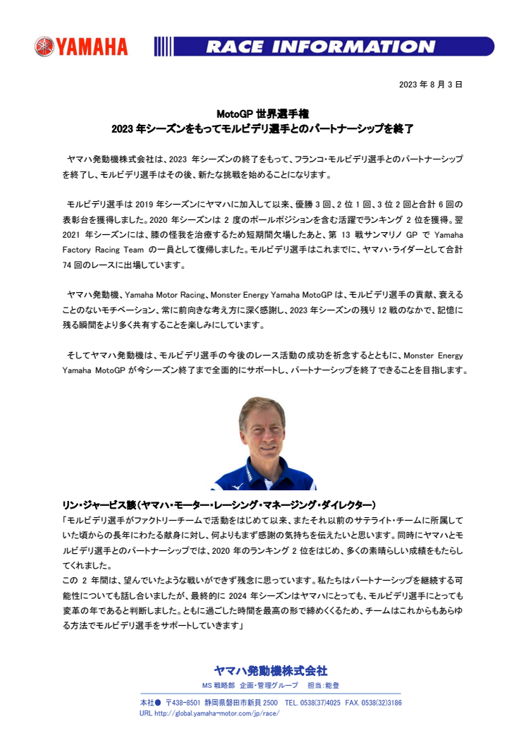 この2年間は、望んでいたような戦いができず残念に思っています。私たちはパートナーシップを継続する可能性についても話し合いましたが、最終的に2024年シーズンはヤマハにとっても、モルビデリ選手にとっても変革の年であると判断しました。ともに過ごした時間を最高の形で締めくくるため、チームはこれからもあらゆる方法でモルビデリ選手をサポートしていきます」