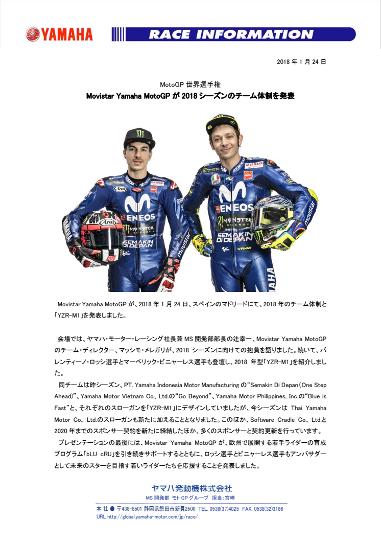 Movistar Yamaha MotoGPが2018シーズンのチーム体制を発表 MotoGP世界選手権