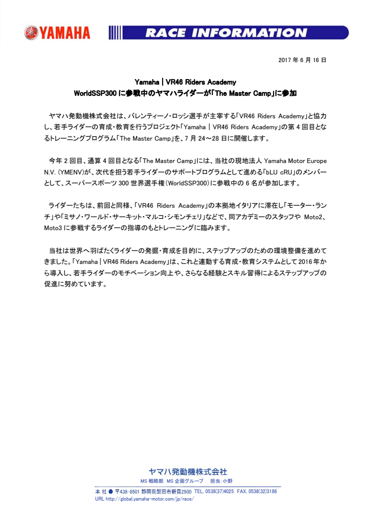 ヤマハ発動機株式会社は、バレンティーノ・ロッシ選手が主宰する「VR46 Riders Academy」と協力し、若手ライダーの育成・教育を行うプロジェクト「Yamaha | VR46 Riders Academy」の第4回目となるトレーニングプログラム「The Master Camp」を、7月24〜28日に開催します。