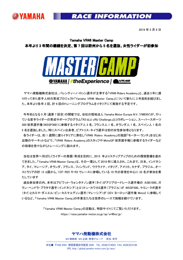 ヤマハ発動機株式会社は、バレンティーノ・ロッシ選手が主宰する「VR46 Riders Academy」と、過去3年に渡り行ってきた若手人材の育成プロジェクト「Yamaha VR46 Master Camp」について新たに3年契約を結びました。本年より各年2回、計6回のトレーニングプログラムをイタリアにて実施する予定です。