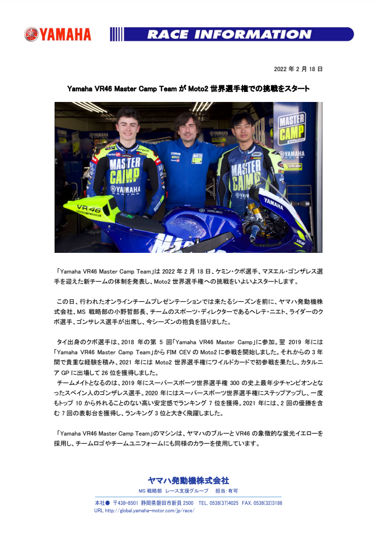 Moto2にデビューする「Yamaha VR46 Master Camp Team」は、当社が出資するオフィシャルチームで、VR46はチームの運営を担当し、Thai Yamaha Motor Co.,Ltd.、Yamaha Motor Europe N.V.、Yamaha Motor Racing Srlのサポートを受けながら、2022シーズンの全21戦に参戦します。