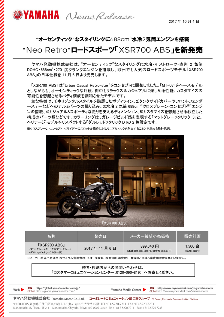 ヤマハ発動機株式会社は、“オーセンティック”なスタイリングに水冷・4 ストローク・直列2 気筒DOHC・688cm3・270 度クランクエンジンを搭載し、欧州でも人気のロードスポーツモデル「XSR700ABS」の日本仕様を11 月6 日より発売します。