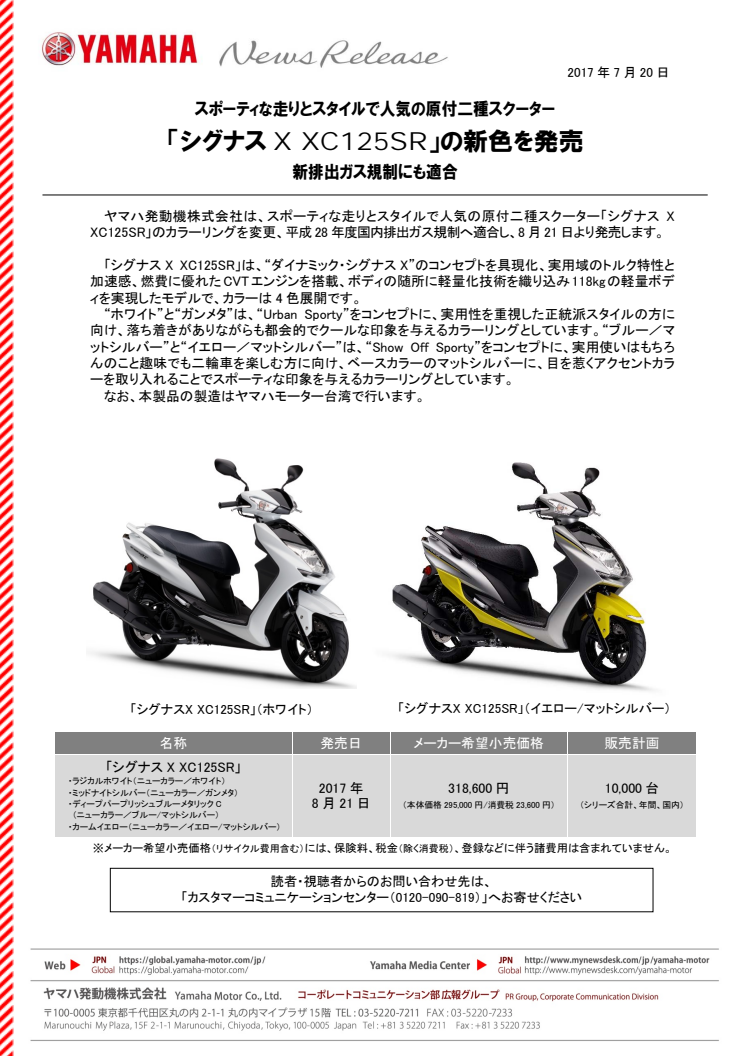 ヤマハ発動機株式会社は、スポーティな走りとスタイルで人気の原付二種スクーター「シグナスX XC125SR」のカラーリングを変更、平成28年度国内排出ガス規制へ適合し、8月21日より発売します。