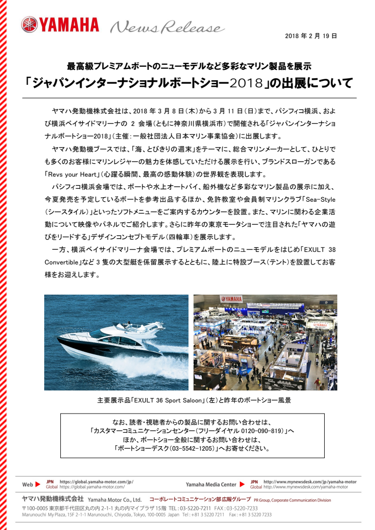 ヤマハ発動機株式会社は、2018年3月8日(木)から3月11日(日)まで、パシフィコ横浜、および横浜ベイサイドマリーナの2会場(ともに神奈川県横浜市)で開催される「ジャパンインターナショナルボートショー2018」(主催:一般社団法人日本マリン事業協会)に出展します。