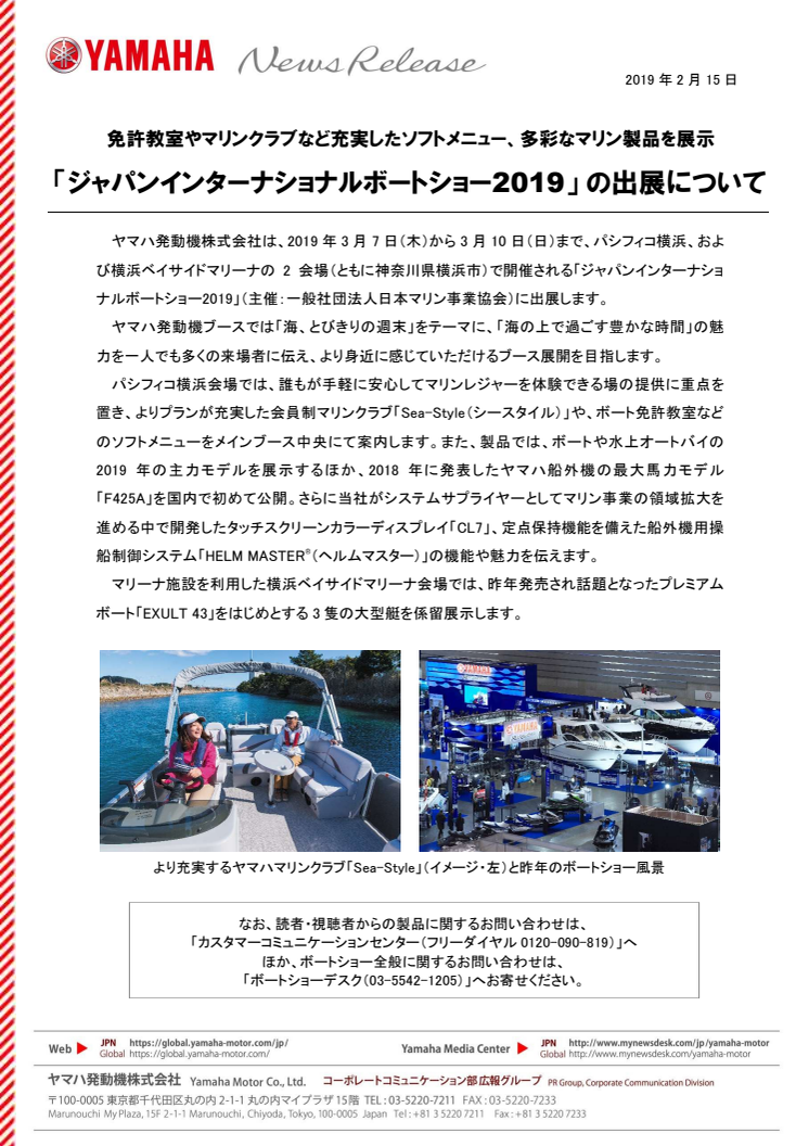 ヤマハ発動機株式会社は、2019年3月7日(木)から3月10日(日)まで、パシフィコ横浜、および横浜ベイサイドマリーナの2会場(ともに神奈川県横浜市)で開催される「ジャパンインターナショナルボートショー2019」(主催:一般社団法人日本マリン事業協会)に出展します。