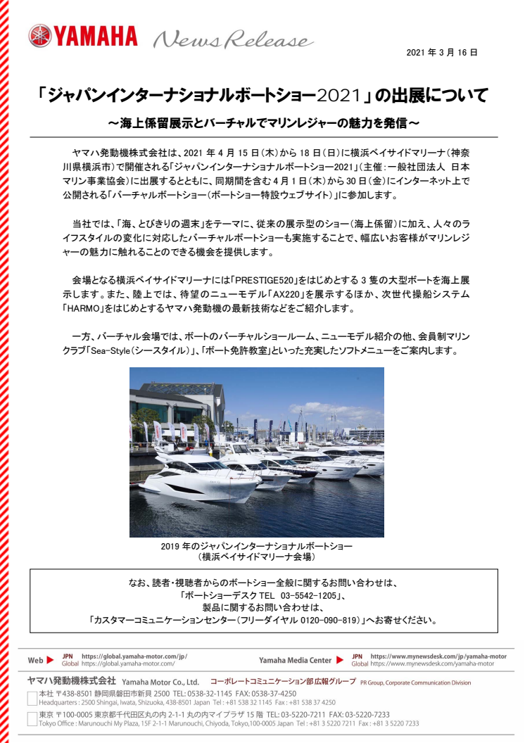 ヤマハ発動機株式会社は、2021年4月15日(木)から18日(日)に横浜ベイサイドマリーナ(神奈川県横浜市)で開催される「ジャパンインターナショナルボートショー2021」(主催:一般社団法人 日本マリン事業協会)に出展するとともに、同期間を含む4月1日(木)から30日(金)にインターネット上で公開される「バーチャルボートショー(ボートショー特設ウェブサイト)」に参加します。